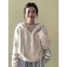 小众软糯连帽拉链毛衣外套女学生2025秋冬新款甜美风白色针织开衫