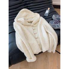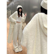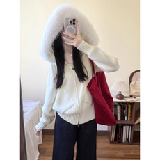 韩系白色毛领连帽针织开衫外套女秋季新款宽松慵懒风软糯拉链毛衣