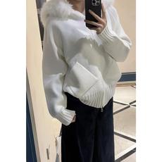 巨好看的白色拉链连帽大毛领毛衣开衫女慵懒风中长款针织外套上衣