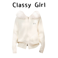 白色毛领连帽针织毛衣外套女高知miu系上衣绝美巨好韩系穿搭开衫