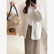 白色麻花毛衣开衫女秋冬新款破洞中长款宽松慵懒风遮屁股针织外套