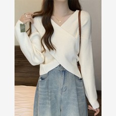 白色不对称V领针织女式下摆衬衫,秋季短外套配修身毛衣和小上衣