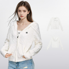 美式白色连帽针织开衫女设计春秋季修身拉链麻花毛衣外套显瘦