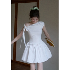 紫涵白色花苞连衣裙女2025夏季新款甜美休闲披肩圆领正肩a字短裙