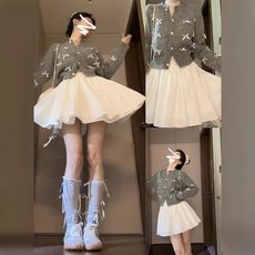 NERESUM白色蝴蝶结百褶裙女夏季甜美蓬蓬花苞半身裙A字蛋糕短裙