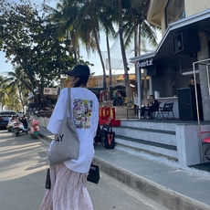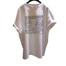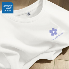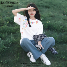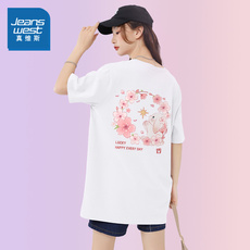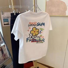 欧货白色花朵印花短袖t恤女夏季后背印花设计感宽松正肩纯棉上衣