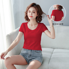 白色纯棉正肩V领短袖t恤女夏季美式修身显瘦短款辣妹收腰纯欲上衣