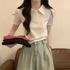 翻领正肩白色t恤女短袖夏季新款爱心刺绣polo领修身显瘦纯棉上衣