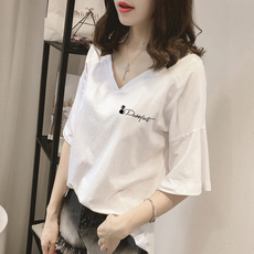 国潮短袖t恤女白色半袖女士V领上衣宽松新款纯棉中国风薄款体恤夏