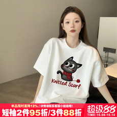 纯棉白色t恤女短袖2025新款夏季大码宽松显瘦卡通设计感开叉上衣