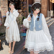 韩系蕾丝拼接牛仔衬衫马甲短外套女夏季法式白色连衣裙两件套套装