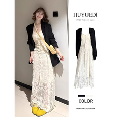 JIUYUEDI九月底温柔风白色蕾丝吊带连衣裙西装外套秋季气质套装