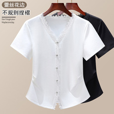 法式蕾丝拼接V领短袖T恤女夏装新款时尚气质白色显瘦修身开叉上衣