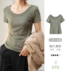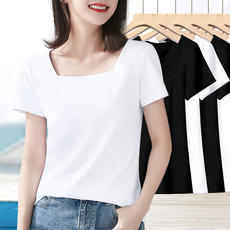 千朔大领口正肩短袖t恤女u领宽松显瘦夏日新款t-恤衫白色低领上衣