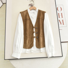 国内Dの一套入!韩系复古V领仿麂皮绒马甲白色衬衫两件套装