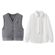 2024秋季新款日系学院风白色V领麻花针织马甲背心+内搭衬衫套装女
