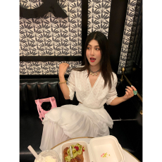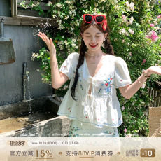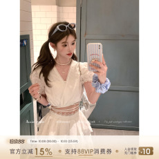 Acaine白色短款v领短袖衬衫高腰a字半身裙套装女夏季法式两件套