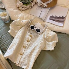 法式夏季新款优雅气质镶钻V领白色短袖衬衫女短款别致上衣