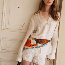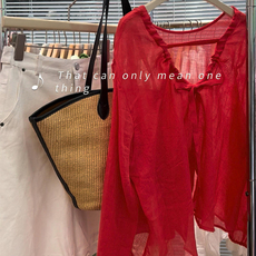 !韩系显白红色两面穿V领系带苎麻防晒衬衫女夏气质薄款小衫