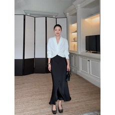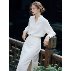 高级感白色v领长袖衬衫女秋季通勤百搭气质半身长裙御姐两件套装