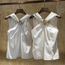 v领白色无袖挂脖衬衫女夏季宽松设计感小众别致法式修身背心上衣