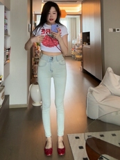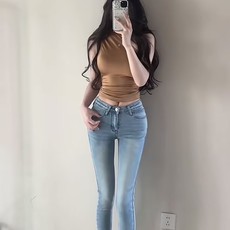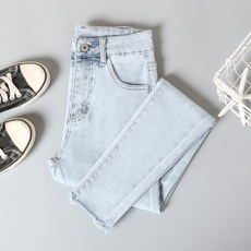 韩系浅蓝色牛仔裤女高腰磨白弹力紧身提臀美胯显瘦百搭九分小脚裤