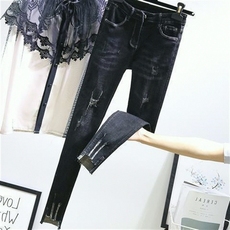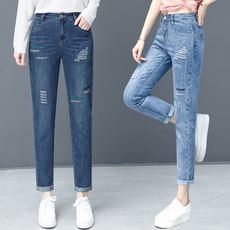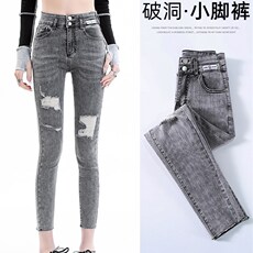 女显瘦韩版九分高腰铅笔裤潮小脚裤百搭牛仔裤破洞紧身弹力春秋季