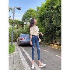 破洞小脚牛仔裤女士春秋弹力修身紧身磨破显瘦显高时尚百搭九分裤