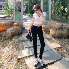 韩系高光磨白黑色牛仔裤女高腰修身提臀弹力显瘦百搭九分小脚裤子