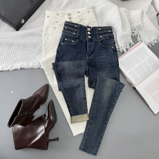 韩系白色排扣高腰牛仔裤女弹力九分裤修身提臀显瘦基础百搭小脚裤