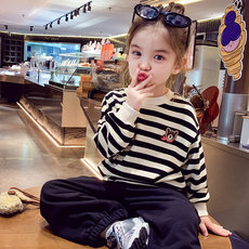 韩国宝宝童装秋装新款男女童洋气条纹圆领长袖T恤卡通百搭打底衫