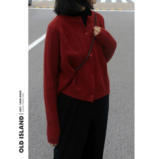 故岛百搭复古红色毛衣开衫外套女秋冬小个子短款麻花针织衫上衣女