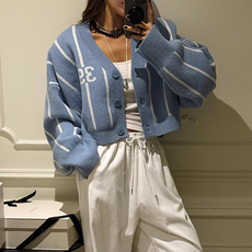 2024秋新款V领针织开衫外套女短款百搭坑条毛衣女宽松外穿长袖