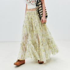 经典黑白腰果花飘逸真丝复古松紧腰大摆半身裙双层长裙沙滩裙蚕丝