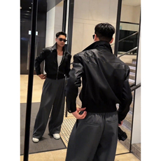 V37美式高街廓形短款皮衣外套男秋季设计感解构分割立领皮夹克潮