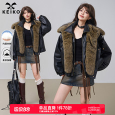 KEIKO 可卸环保雪狼狐毛领黑色皮衣棉服女秋冬机车风短款夹棉外套