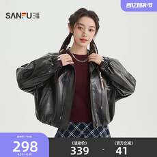 三福皮衣外套女2026新款春季时尚宽松兜摆翻领黑色夹克女装517586