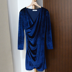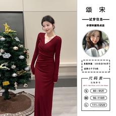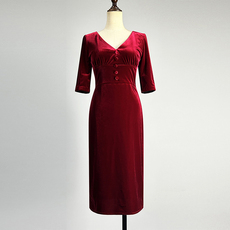 颂宋 新款法式性感修身V领褶皱收腰连衣裙直筒裙DT1081