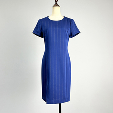 品牌撤柜藏青色条纹短袖连衣裙女2025职业装修身显瘦开衩直筒裙