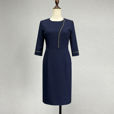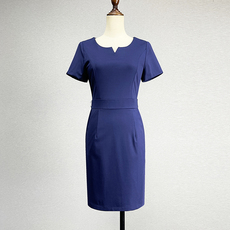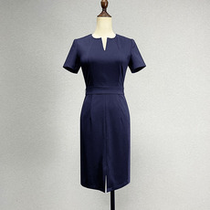品牌职业装中长款藏青色短袖连衣裙女2025修身显瘦气质包臀直筒裙