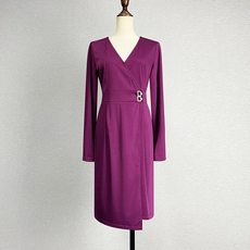 中长款紫色长袖连衣裙女2025弹力修身性感V领针织包臀裙直筒裙