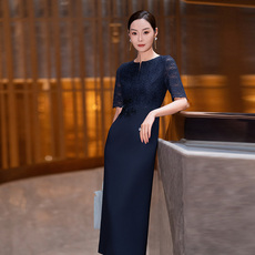 中长款藏青色七分袖连衣裙女2024修身显瘦气质百搭职业包臀直筒裙