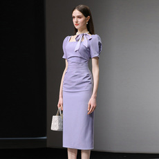 2025夏季新款气质优雅经典方领捏褶泡泡袖收腰修身包臀直筒连衣裙
