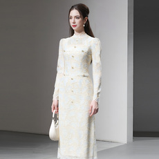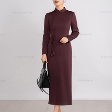 新中式国风连衣裙2025春秋季新款端庄大气修身长袖立领醋酸直筒裙