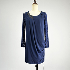 蓝色蕾丝九分袖连衣裙2025弹力修身性感镂空钉珠直筒裙小个子中裙