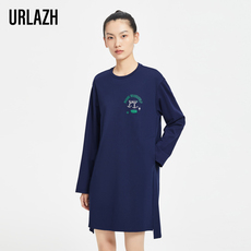 URLAZH有兰新款藏青长袖圆领直筒休闲修身显瘦小众连衣裙