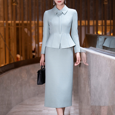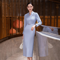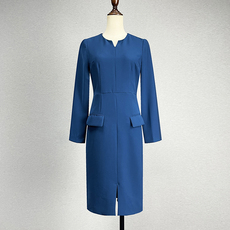 品牌中长款蓝色长袖连衣裙女2025职业装修身显瘦前开衩气质直筒裙