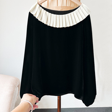 云澍 丝绒拼接真丝欧根纱新中式宽松圆领休闲长袖上衣T恤女秋冬