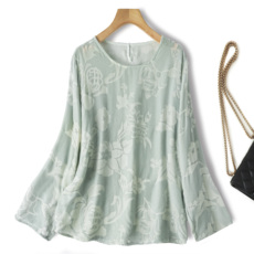 精美刺绣真丝丝绒减龄娃娃衫女宽松圆领套头桑蚕丝上衣长袖衬衫新