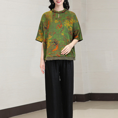 桑蚕丝短袖T恤女2025春夏新中式印花国风宽松透气缎面真丝上衣